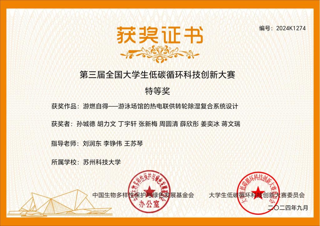 孙城德、胡力文、丁宇轩、张新梅、周圆清、薛欣彤、姜奕冰、蒋文瑞等学生参加,刘润东、王苏琴指导的《“游燃自得”——游泳馆场景下的热电联供转轮除湿复合系统设计》荣获全国特等奖;由温世炀、周宇璐、 朱秀锦、季泽宇、徐立阁、曾羽婷等学生参加,刘润东、钱飞跃、李瀚翔指导的《河道巡“螺”——集检测、识别、灭杀功能的福寿螺智能机器人》荣获全国三等奖。