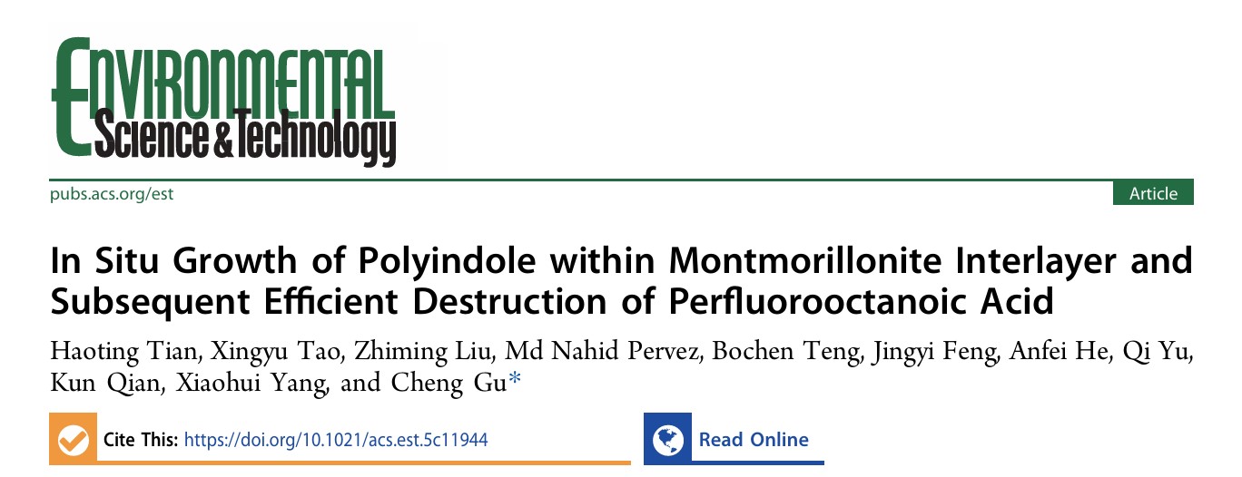 田浩廷副教授的最新研究成果刊登在环境类顶级学术期刊《Environmental Science & Technology》上,研究成果题目为“In Situ Growth of Polyindole within Montmorillonite Interlayer and Subsequent Efficient Destruction of Perfluorooctanoic Acid”。 白菜彩金论坛