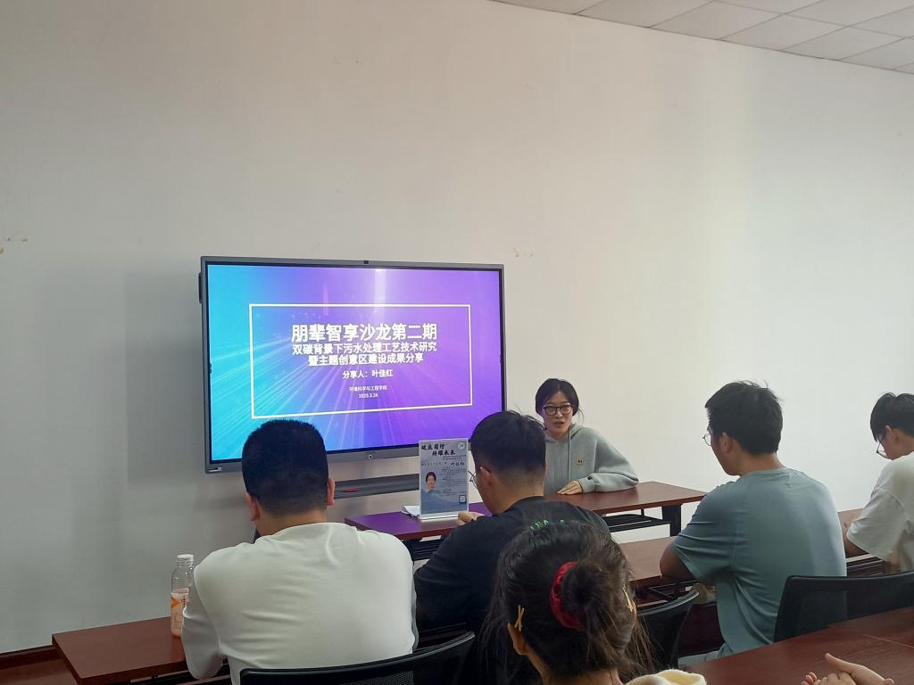 A栋二楼会议室圆满举行。活动主题为“破浪前行,科耀未来——双碳背景下污水处理工艺技术研究暨主题创意区建设成果分享”。本次活动邀请了来自资源与环境专业的优秀研究生叶佳红作为主讲嘉宾。活动由王倩颖主持。